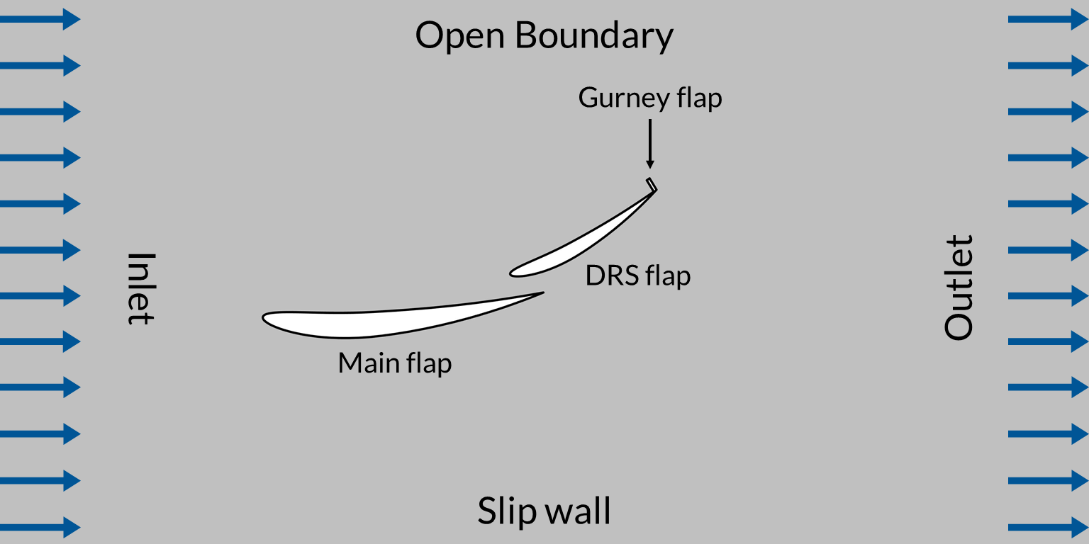 A typical rear wing assembly in a Formula 1 car consists of two wings that span the width of the car. Vertical endplates are attached to the sides of the wings to manage airflow and reduce drag caused by wingtip vortices. In our model, we consider a 2D cross section of a rear wing assembly for simplicity. This enables us to ignore the endplates and consider the cross-sectional geometry of the two wings. We will refer to the upper wing as the “DRS flap” and the lower wing as the “main flap”. (Note that only the upper wing is adjustable.) A NACA 6409 airfoil is used for both of the wings. While the NACA 6409 airfoil does not truly represent the rear wing of a Formula 1 car, this model is intended to simply demonstrate the effect of an adjustable flap on aerodynamic drag and downforce. A gurney flap is fixed to the tail end of the DRS flap and is typically used to increase downforce without significantly increasing drag. The wings are assumed to be perfectly rigid.